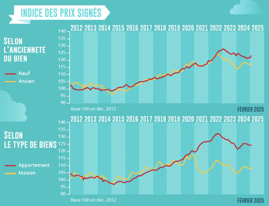 Cependant, les données récentes indiquent une stabilisation des prix. Au quatrième trimestre 2024, les prix des logements anciens en France métropolitaine ont baissé de 2,1 % sur un an, mais sont restés quasi stables sur trois mois (+0,1 %) .​(Notaires+1Notaires+1)