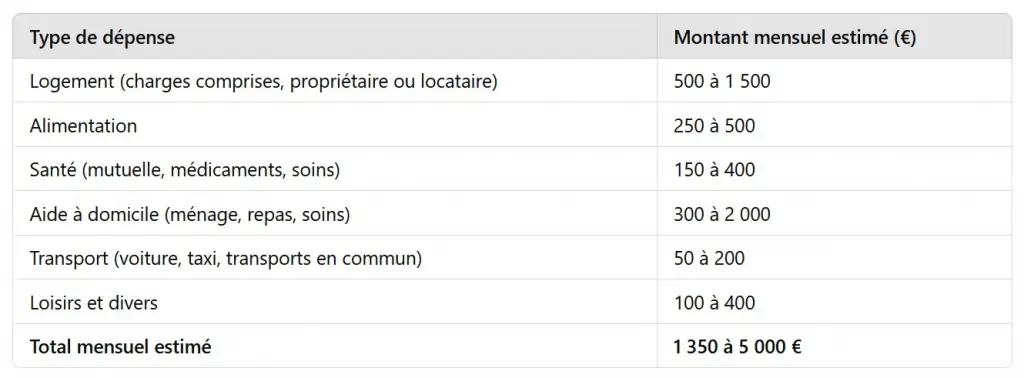 Voici une estimation des coûts mensuels pour une personne âgée vivant en France :
