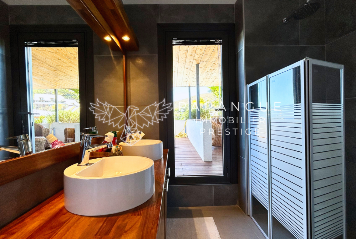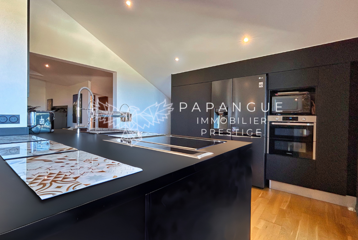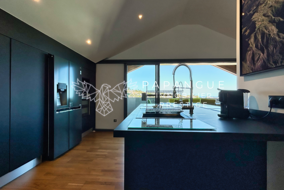 Dès l’arrivée, le regard se laisse capturer par la vue à couper le souffle, un tableau vivant sur l’océan et les toits de la station balnéaire. La pièce de vie, baignée de lumière, déploie des volumes généreux grâce à sa belle hauteur sous plafond, et s’ouvre naturellement sur une terrasse double de plus de 75 m2, véritable prolongement à ciel ouvert.