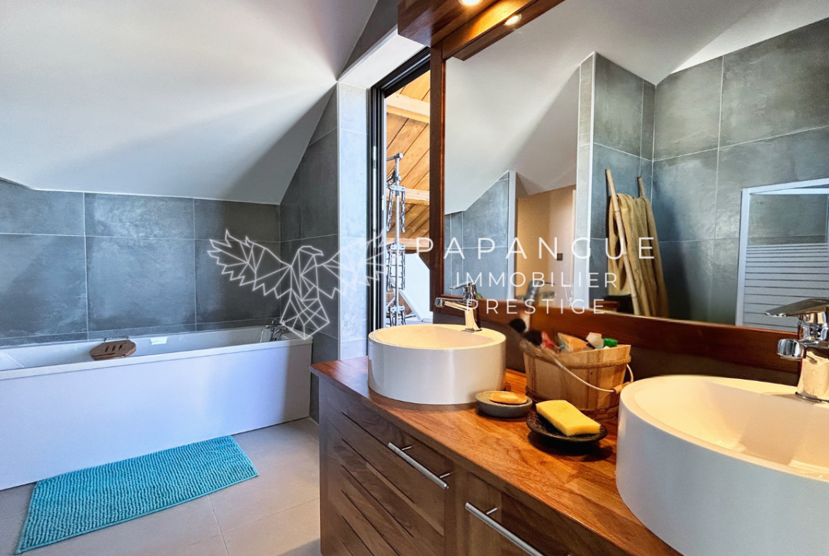 L’espace nuit s’articule autour d’un premier WC séparé pour les invités, puis s’ouvre sur deux ailes distinctes : la première propose une chambre avec rangements intégrés, la seconde offre deux vastes suites, chacune dotée de son propre dressing et de sa salle d’eau privative. La suite parentale bénéficie d’un accès direct à la terrasse, et dispose en plus d’une salle de bains complète avec baignoire et douche. Le tout dans une ambiance feutrée, élégante, et résolument tournée vers l’extérieur.