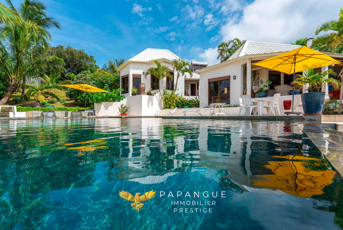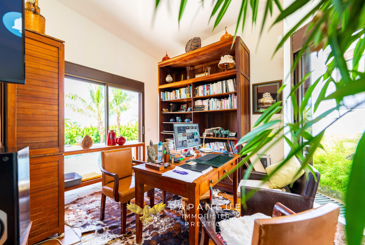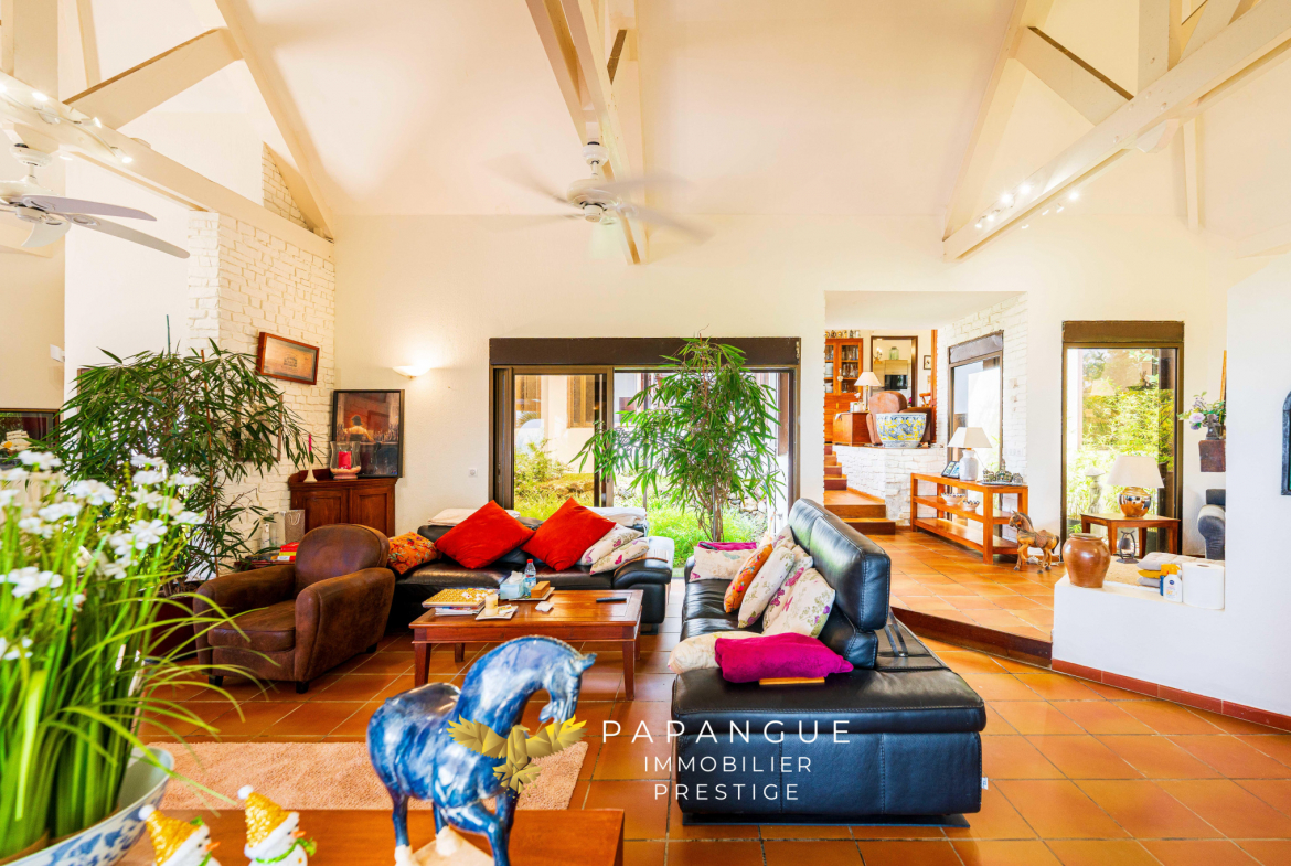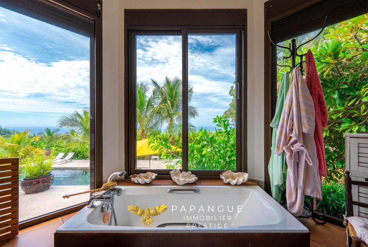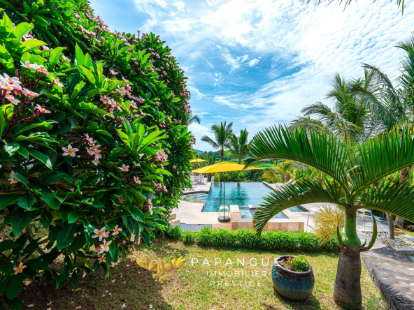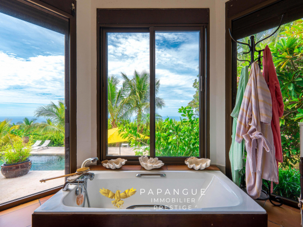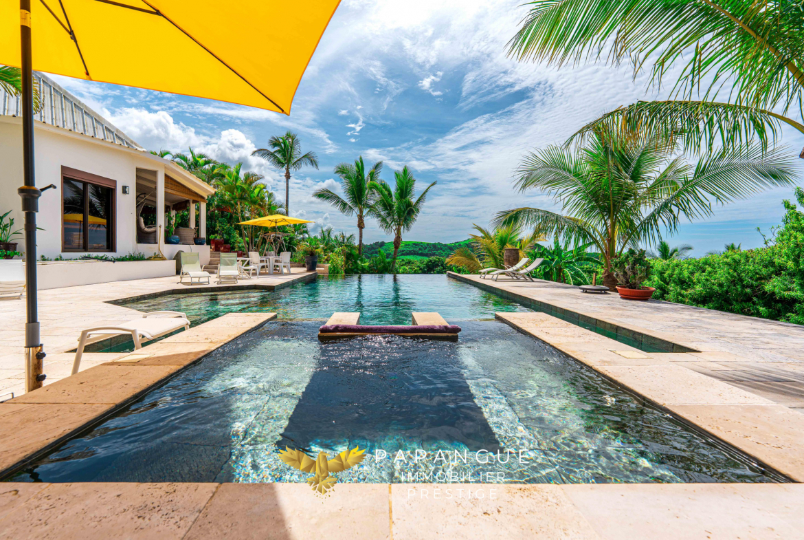 Au coeur de ce havre de paix, la villa développe plus de 220 m2 habitables, auxquels s’ajoutent varangues et annexes, assurant une parfaite continuité entre intérieur et extérieur. La vaste plage de piscine de plus de 100 m2, réalisée avec des matériaux nobles, s’intègre harmonieusement dans le paysage et s’accompagne d’une vue à couper le souffle.