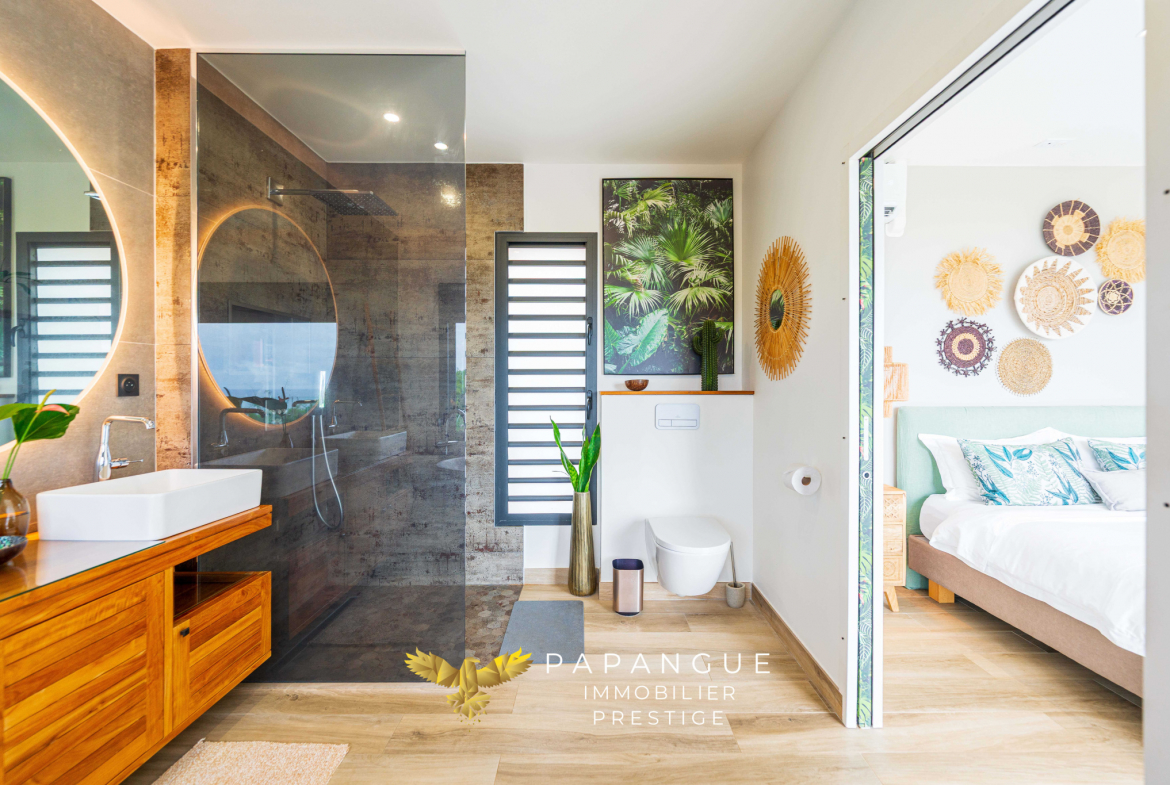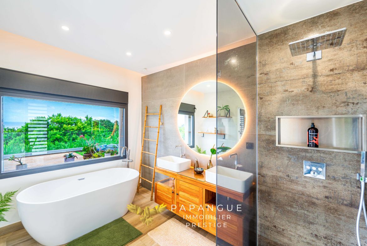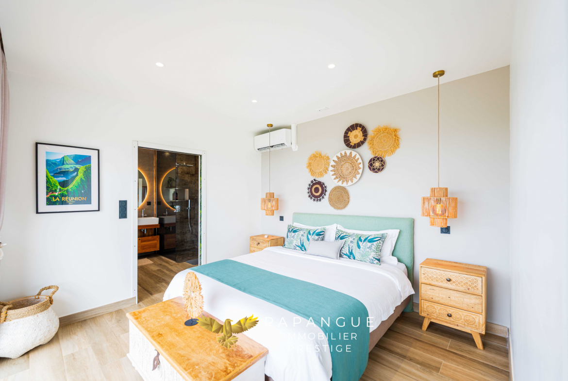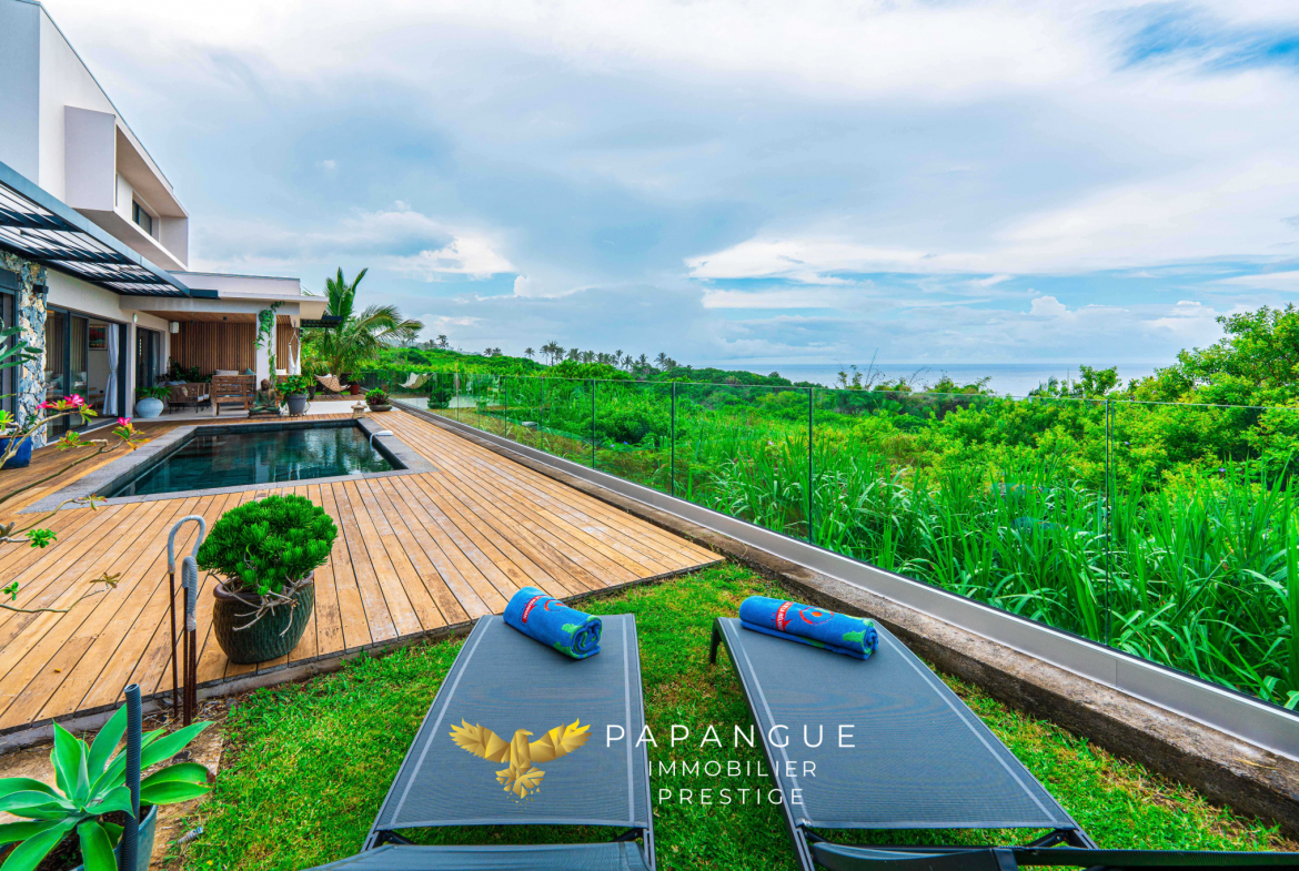 Dès l’entrée de la propriété le ton est donné : La porte de la villa s’ouvre grâce à vos empreintes, l’entrée dessert un salon/ séjour lumineux et confortable grâce à ses larges baies ouvertes sur la mer et sa belle hauteur sous plafond. La décoration soignée et élégante vous permettra de passer de bons moments en famille à l’intérieur même si le regard est attiré vers l’extérieur : une magnifique terrasse, une varangue et une piscine en pierres naturelles se partagent une vue mer à couper le souffle avec les vols de paille en queue ou de papangues et le ballet des baleines en saison ! La cuisine totalement aménagée et équipée avec de l’électroménager haut de gamme permet de recevoir en toute convivialité dans cet espace vie cocooning .