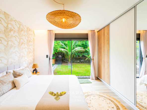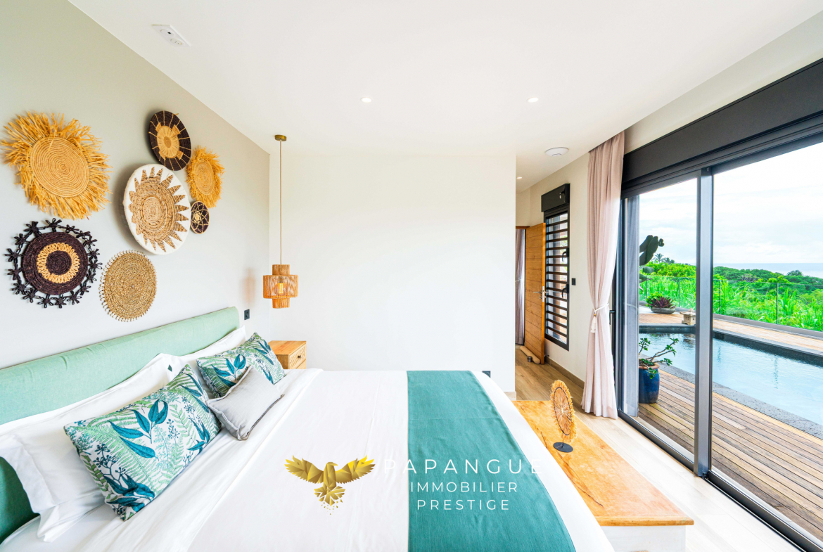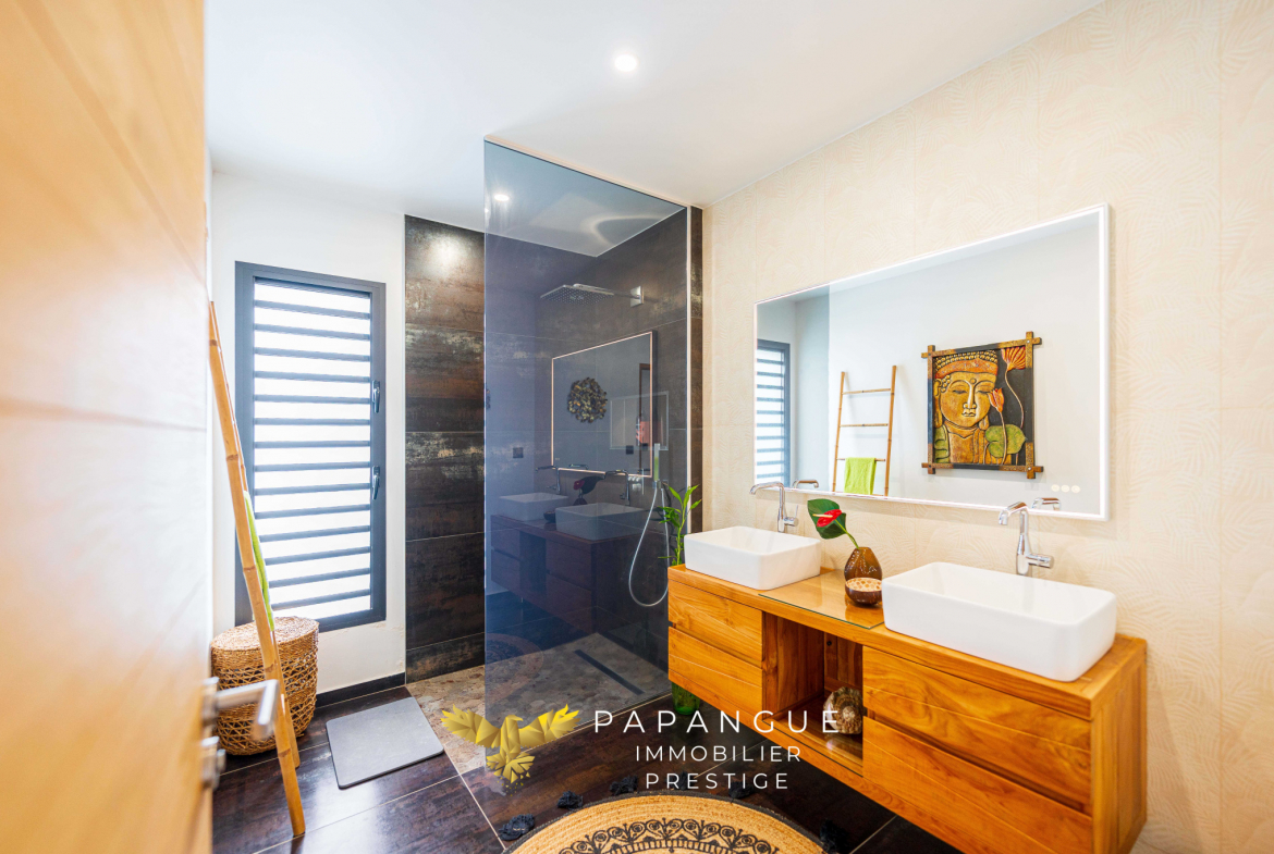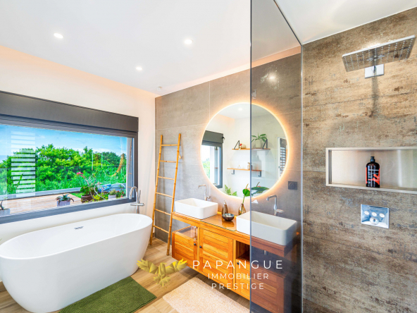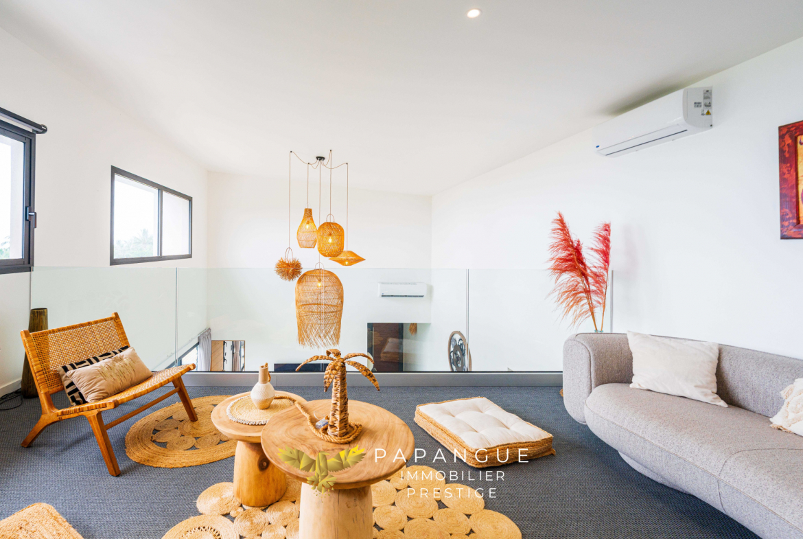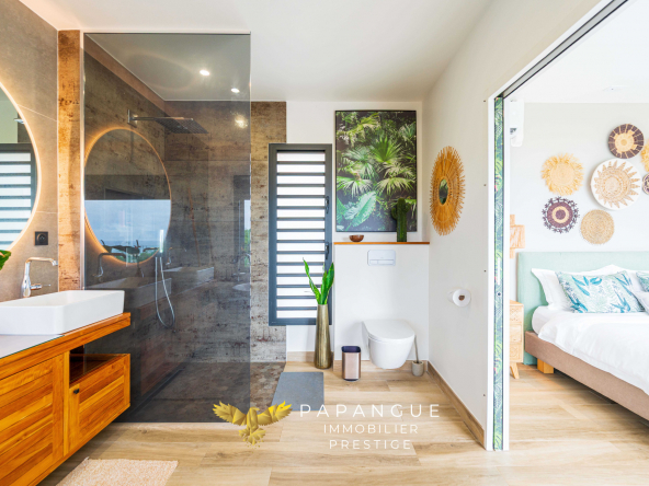 Dès l’entrée de la propriété le ton est donné : La porte de la villa s’ouvre grâce à vos empreintes, l’entrée dessert un salon/ séjour lumineux et confortable grâce à ses larges baies ouvertes sur la mer et sa belle hauteur sous plafond. La décoration soignée et élégante vous permettra de passer de bons moments en famille à l’intérieur même si le regard est attiré vers l’extérieur : une magnifique terrasse, une varangue et une piscine en pierres naturelles se partagent une vue mer à couper le souffle avec les vols de paille en queue ou de papangues et le ballet des baleines en saison ! La cuisine totalement aménagée et équipée avec de l’électroménager haut de gamme permet de recevoir en toute convivialité dans cet espace vie cocooning .