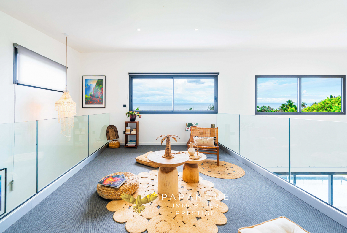 A l’étage, la mezzanine, dotée elle aussi d’une vue incroyable sur l’océan, offre un espace supplémentaire polyvalent : Salon détente, bureau …