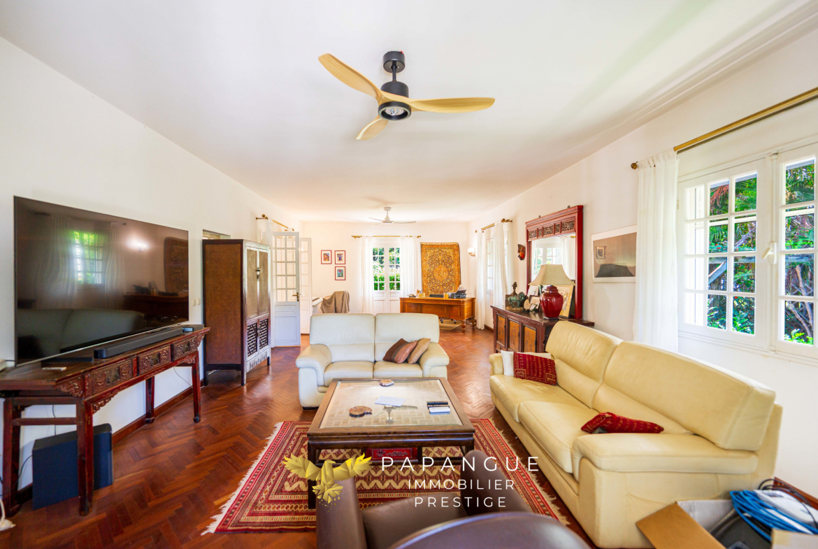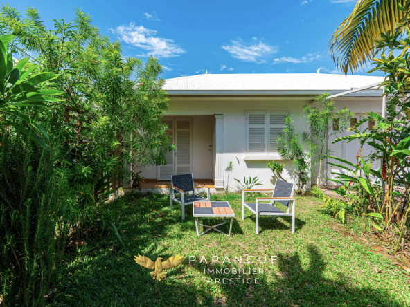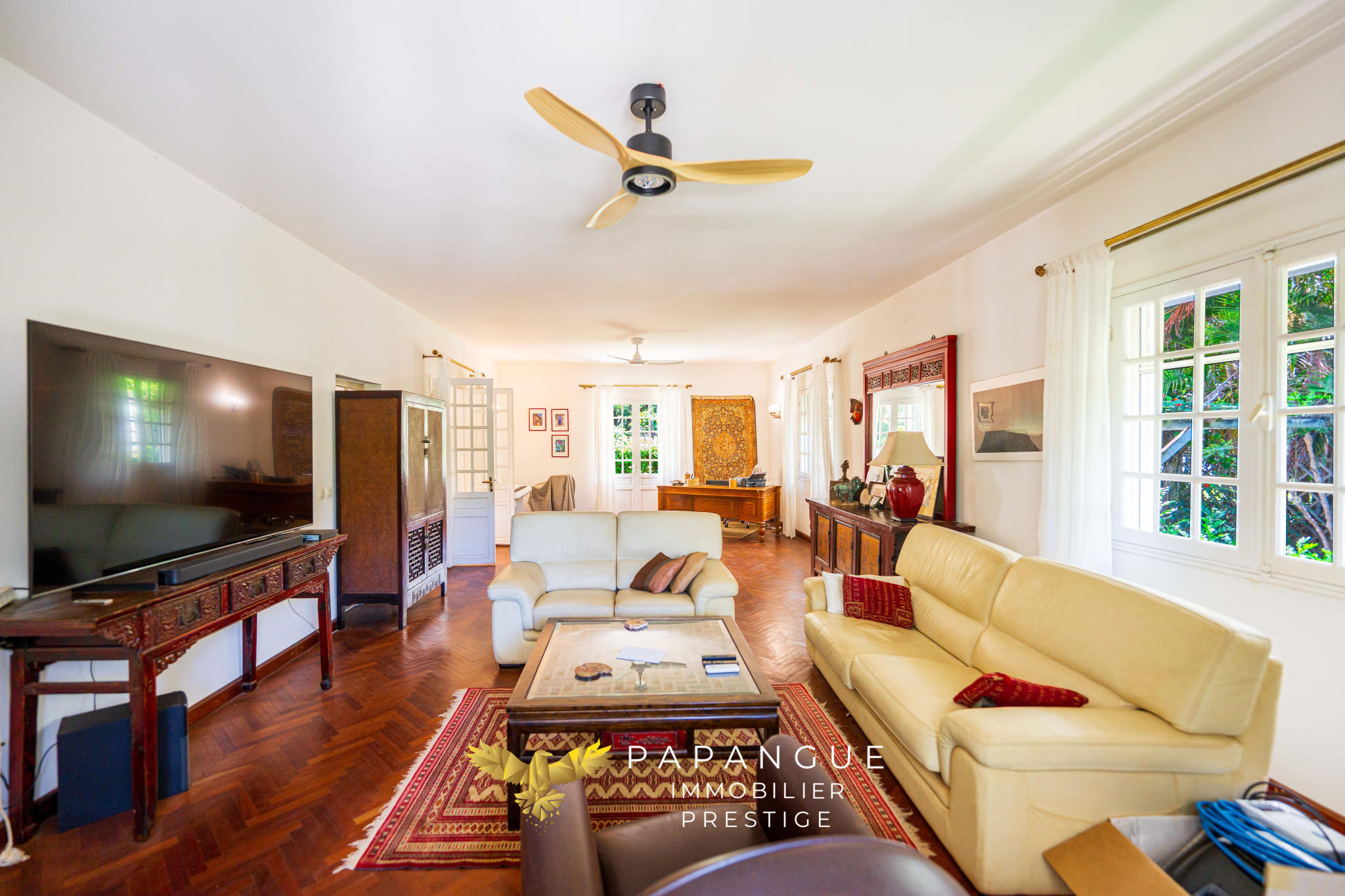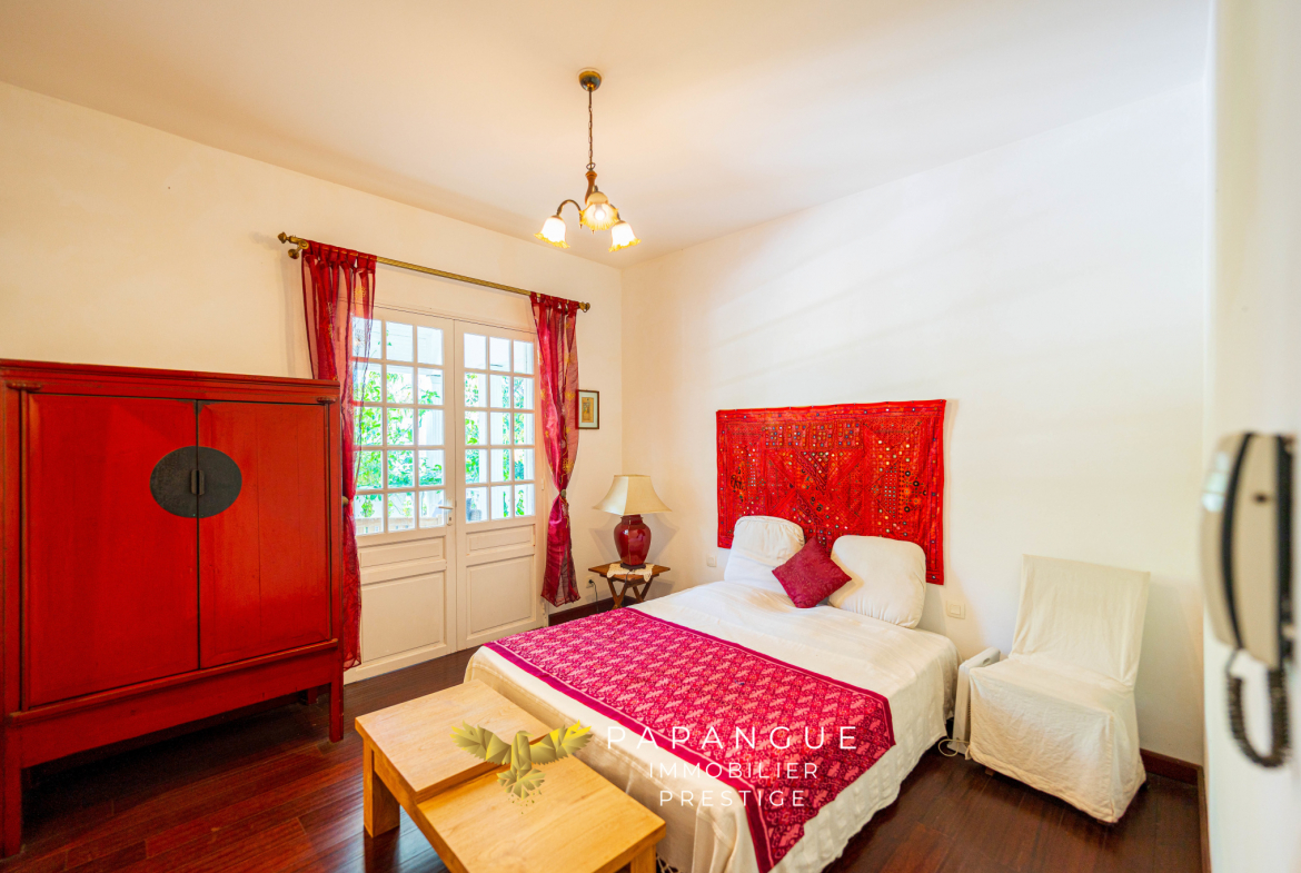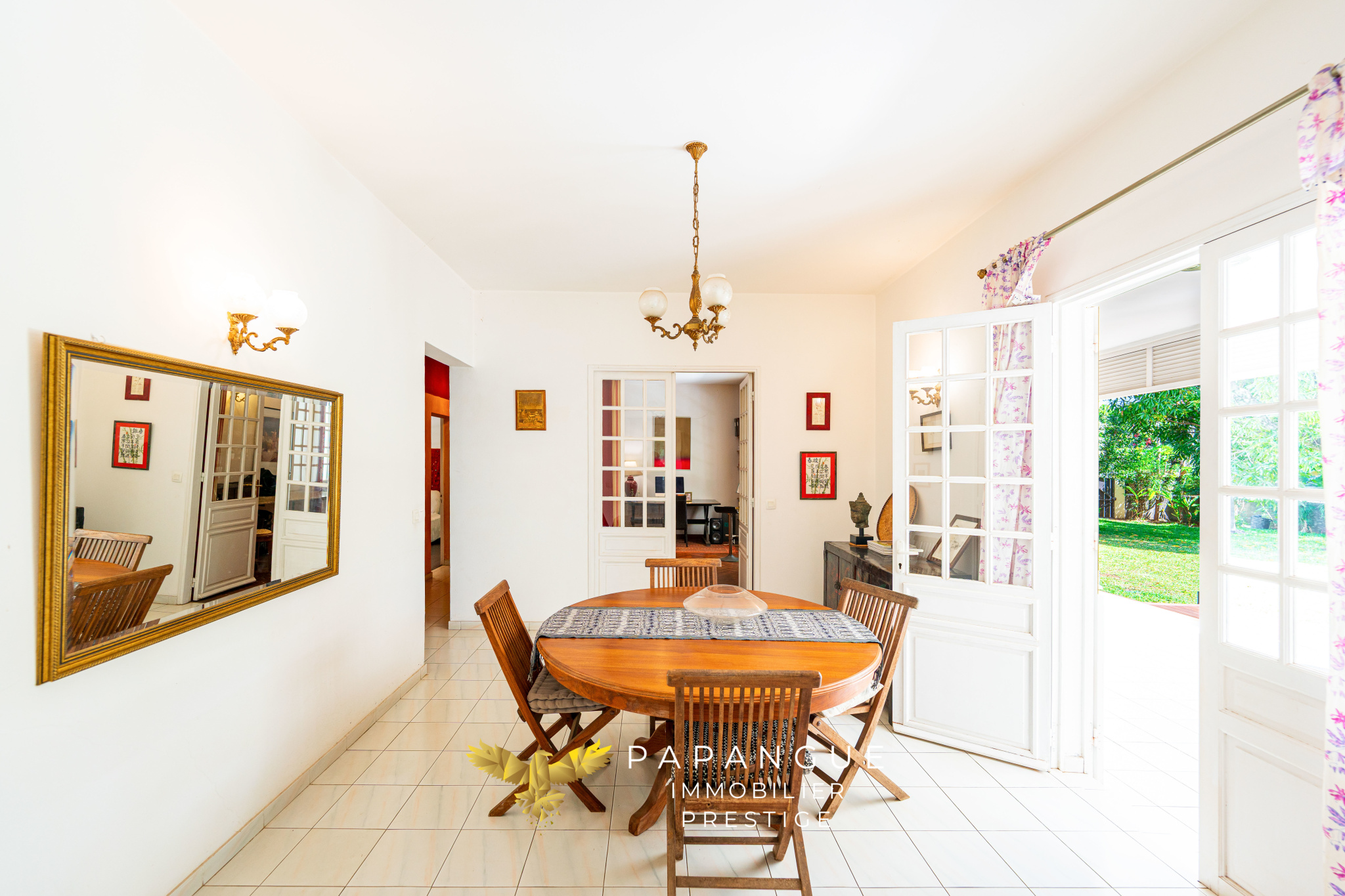 Cette demeure créole de la fin des années 80, parfaitement intégrée à son environnement, s’épanouit au coeur d’un jardin luxuriant, richement arboré de fruitiers et de nombreuses essences tropicales. La maison principale séduit dès les premiers instants par son atmosphère chaleureuse et élégante : un vaste séjour sublimé par un parquet en bois, une bibliothèque, un salon de réception, et une cuisine aménagée pensée pour la convivialité.