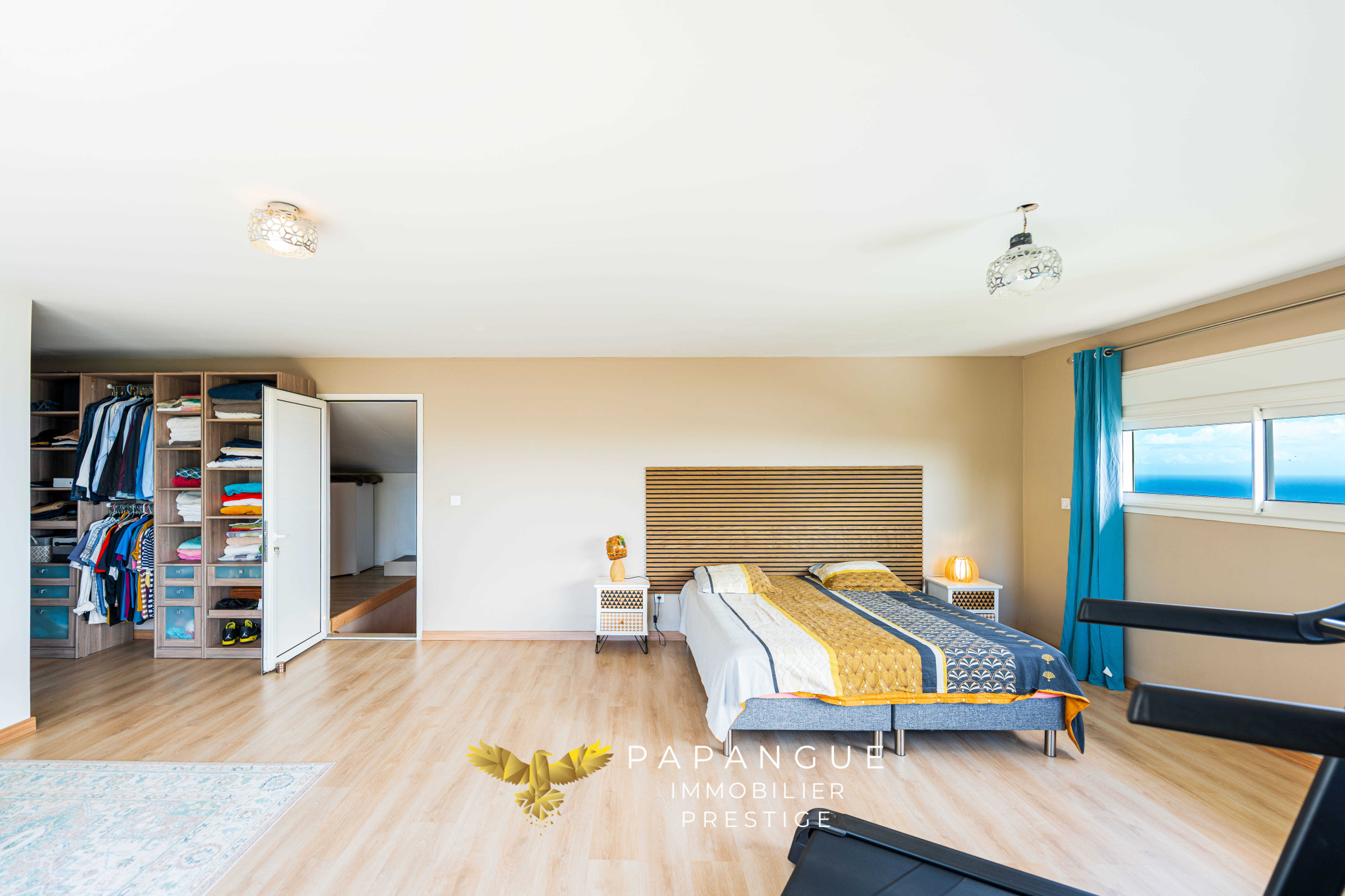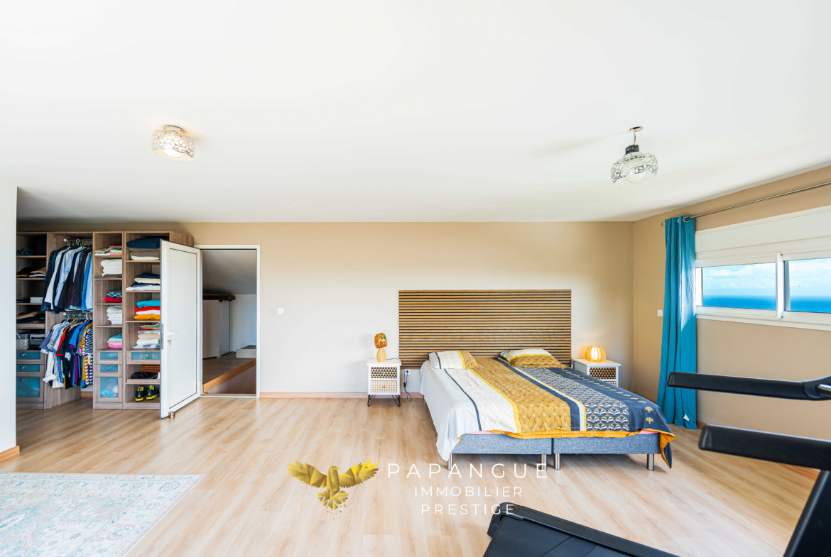 À l’étage, la master bedroom s’impose comme un véritable lieu de retraite. Spacieuse et baignée de lumière, elle dispose de son dressing sur mesure et d’une salle de douche panoramique, elle offre une vue exceptionnelle sur l’océan et la ville. Un espace à part, conçu pour la détente et la sérénité.