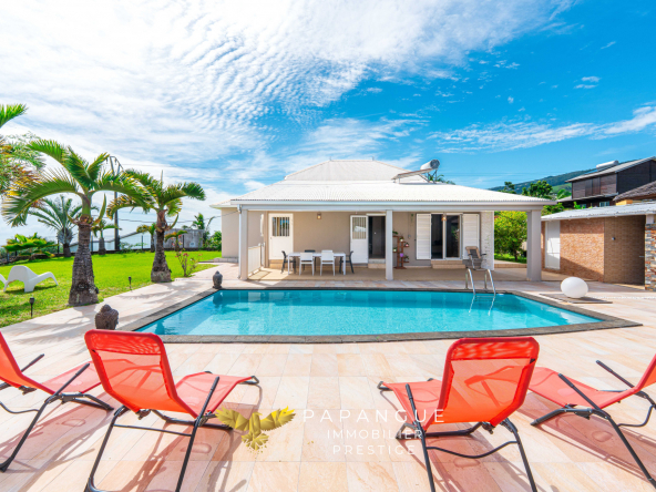 À l’extérieur, la piscine s’intègre dans un jardin paysager où chaque détail a été soigné. Le kiosque et la cuisine créole prolongent la convivialité, tandis que les aménagements extérieurs invitent à profiter du climat et de la vue toute l’année.