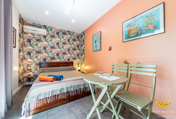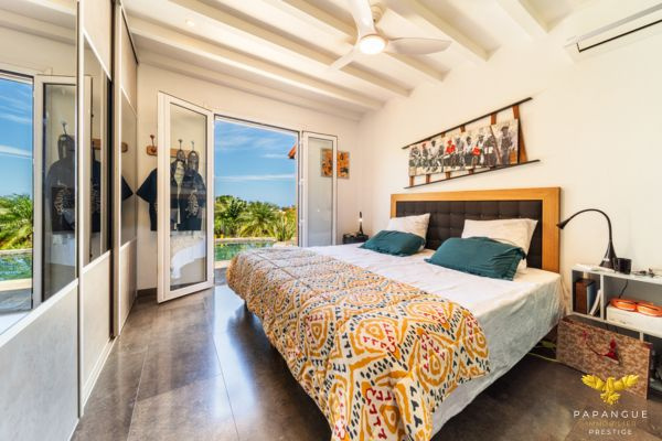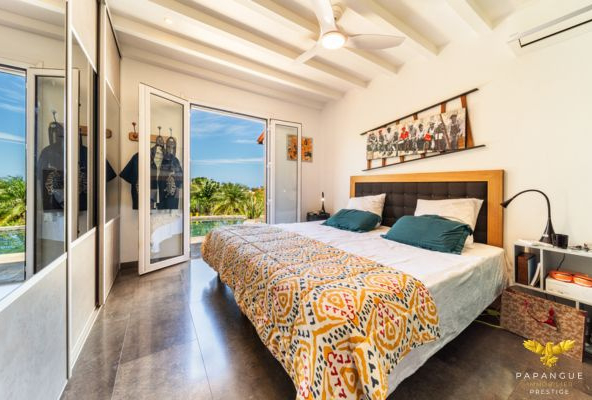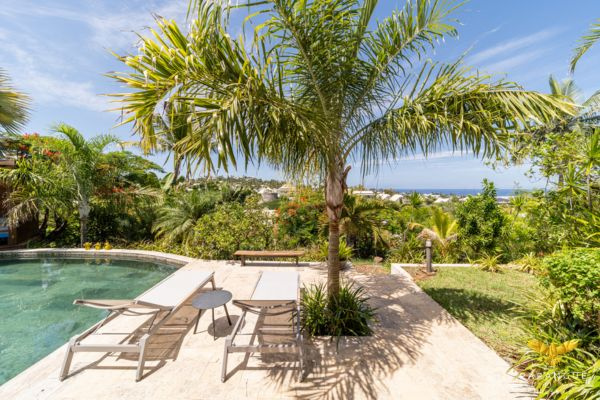 Les extérieurs ont été pensés pour profiter pleinement du cadre. La piscine en pierre s’intègre harmonieusement au jardin, tandis que le guétali offre un véritable espace de détente avec la mer en perspective. Un studio indépendant d’environ 15 m2, entièrement équipé, complète l’ensemble.